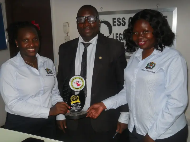 Ms. Aveline Ombock (right) and Nuru Mwambemba (left) congratulate accredited mediator Erick Mukiza (center) on receiving an award from the High Court Mediation Centre in recognition of his contribution to promoting mediation in Tanzania.